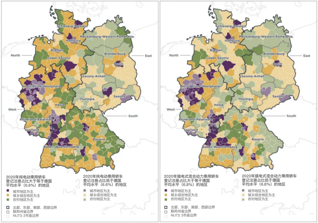 图1. 2020年纯电动汽车(左)和插电式混合动力汽车(右)在乘用车新车登记注册中的份额占比(等于/高于/低于德国平均水平),按德国NUTS 3级县市分类划分。
