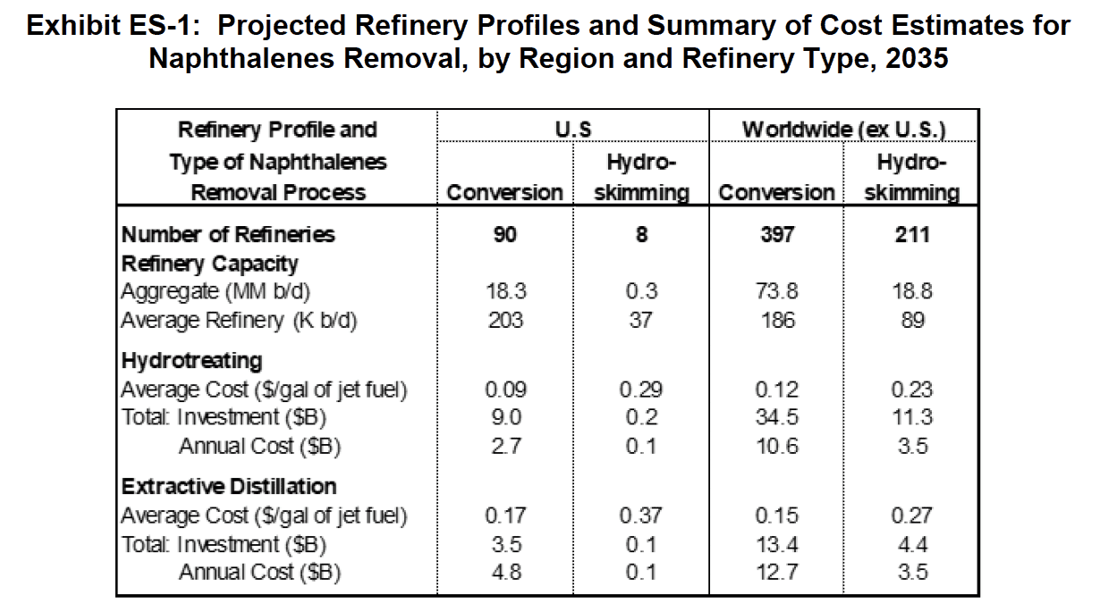 研究考虑了两种炼油工艺:加氢处理和萃取蒸馏。分析表明,仅通过处理直馏煤油(石油喷气燃料中萘类物质的主要存在部分),这两种工艺均可去除石油喷气燃料中的大部分萘类物质。研究得出结论:对于转化型炼油厂(附录ES-1)而言,加氢处理技术控制萘类物质的成本为每加仑0.09至0.12美元,而这类炼油厂是全球多数地区石油喷气燃料的主要供应商。