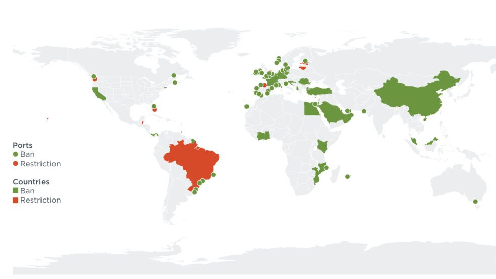 图. 至2023年2月公布的各国及港口对洗涤器的禁令和限制措施
