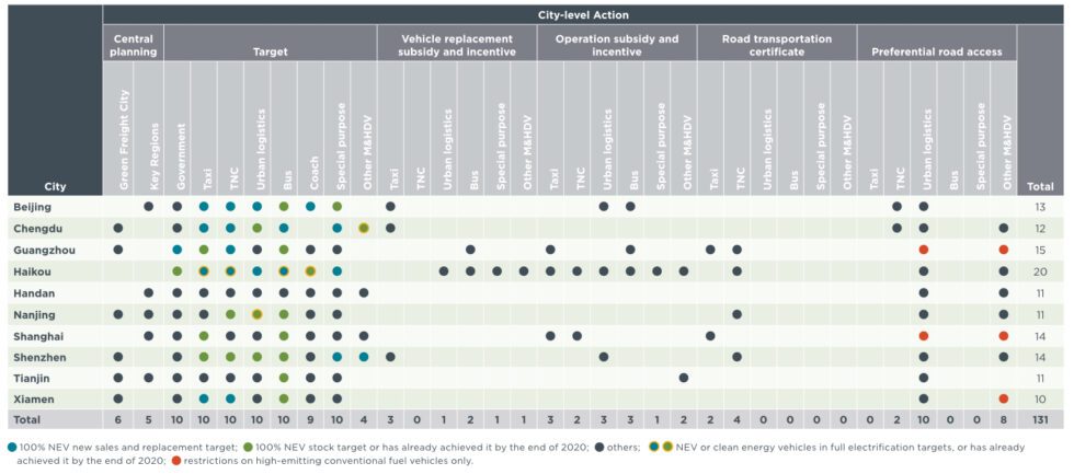 中国各城市正通过多样的激励措施推动商用车队电动化。本报告梳理了10个城市的新能源商用车(NECV)主要政策,以及指导城市行动的相关国家政策,并将这些激励措施与2020 年的市场表现进行了对比。广泛采用的政策工具包括运营补贴、路权优惠、重污染天气期间禁行传统燃料卡车,以及逐步取消传统燃料出租车和其他商用车的道路运输许可证等。