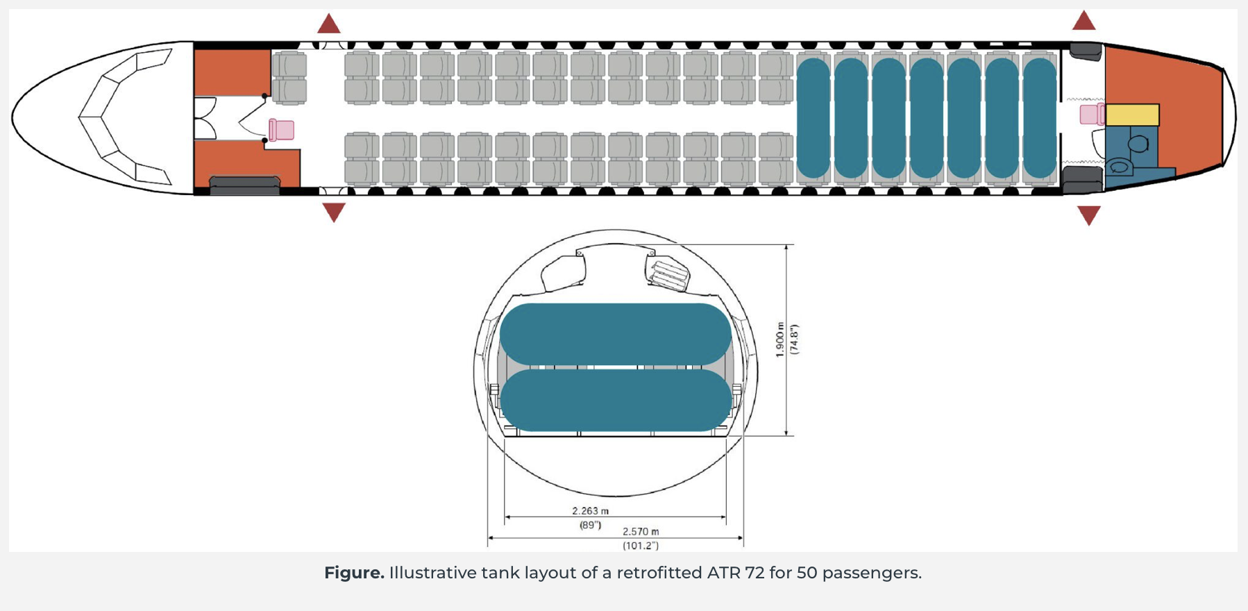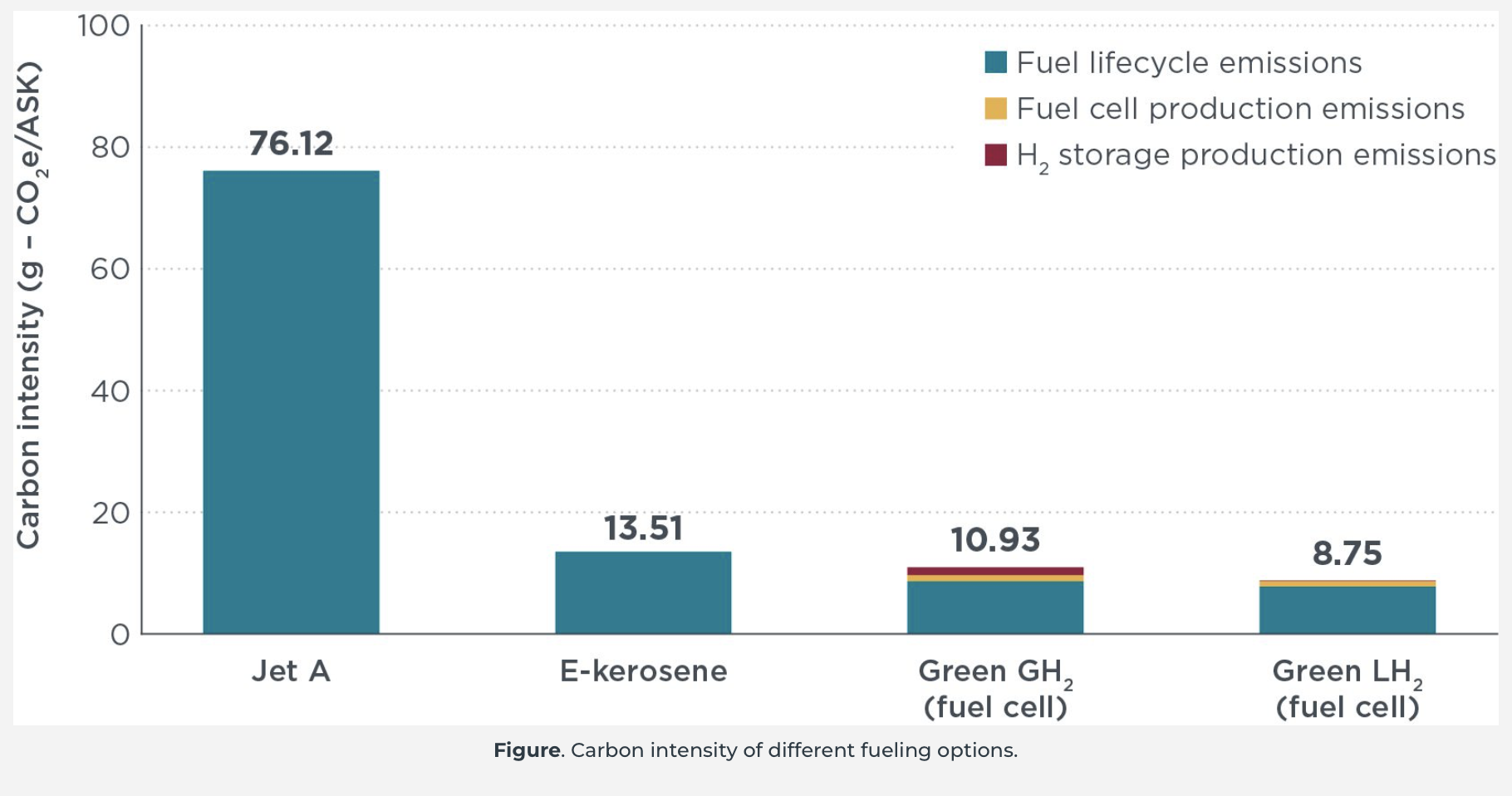 本研究以400公里和700公里(约为纽约市至华盛顿特区的距离)的航程为场景,模拟 ATR 72飞机的实际使用情况。在此类航程下,一架燃料电池飞机的能源强度与碳强度更低,加氢成本略高,但每年可减少2500吨温室气体排放。
