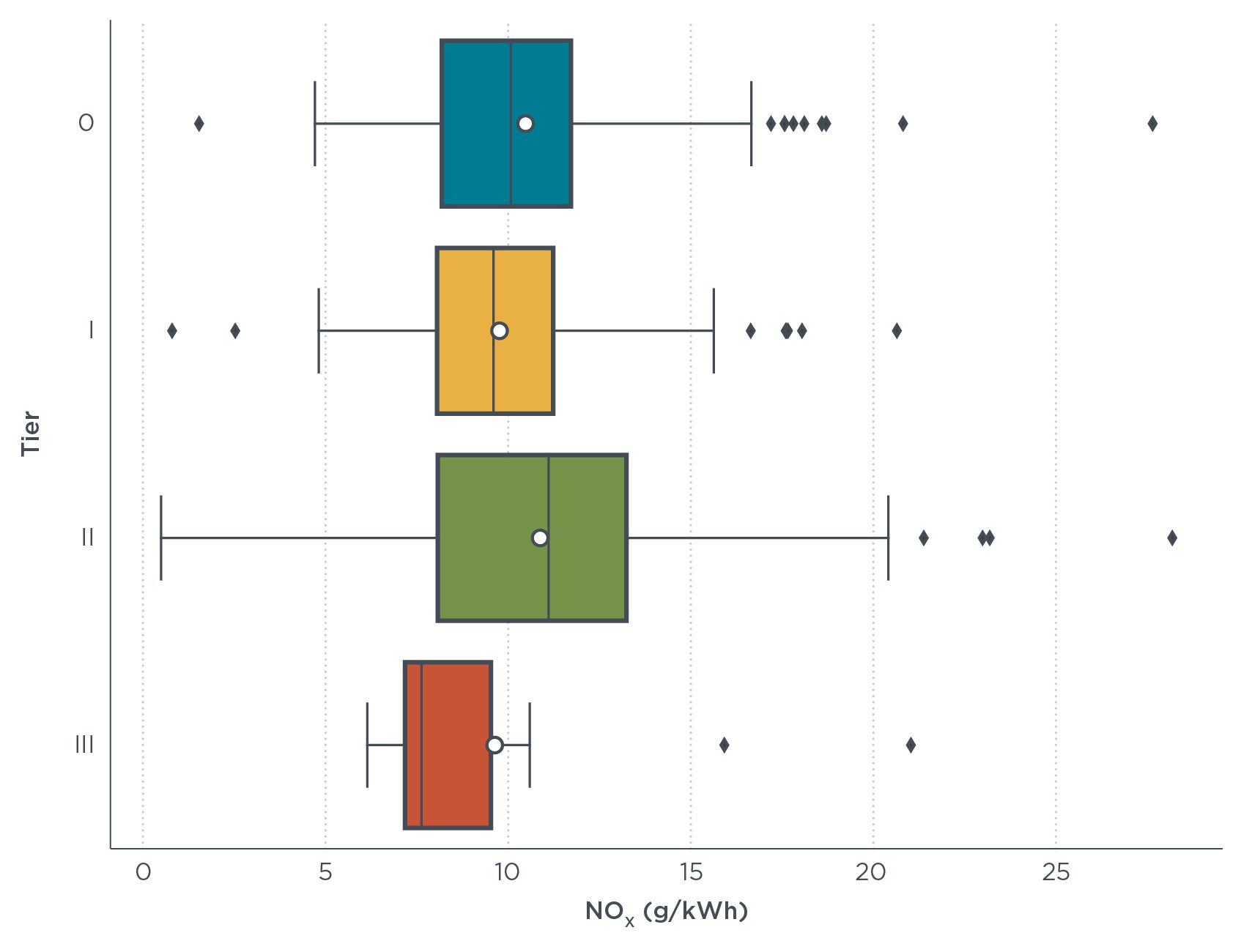 较新型的Tier II级发动机,其氮氧化物排放速率显著高于较老旧的Tier I级发动机;此外,未受法规管控的Tier 0级发动机与Tier II级发动机的氮氧化物排放速率,在统计层面并无差异。