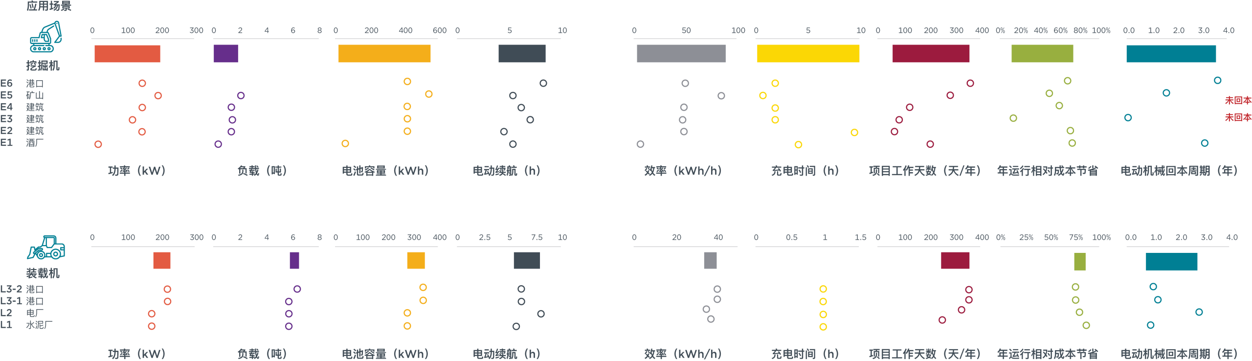 图2. 电动挖掘机和电动装载机的应用场景、技术规格以及成本平价对比结果汇总