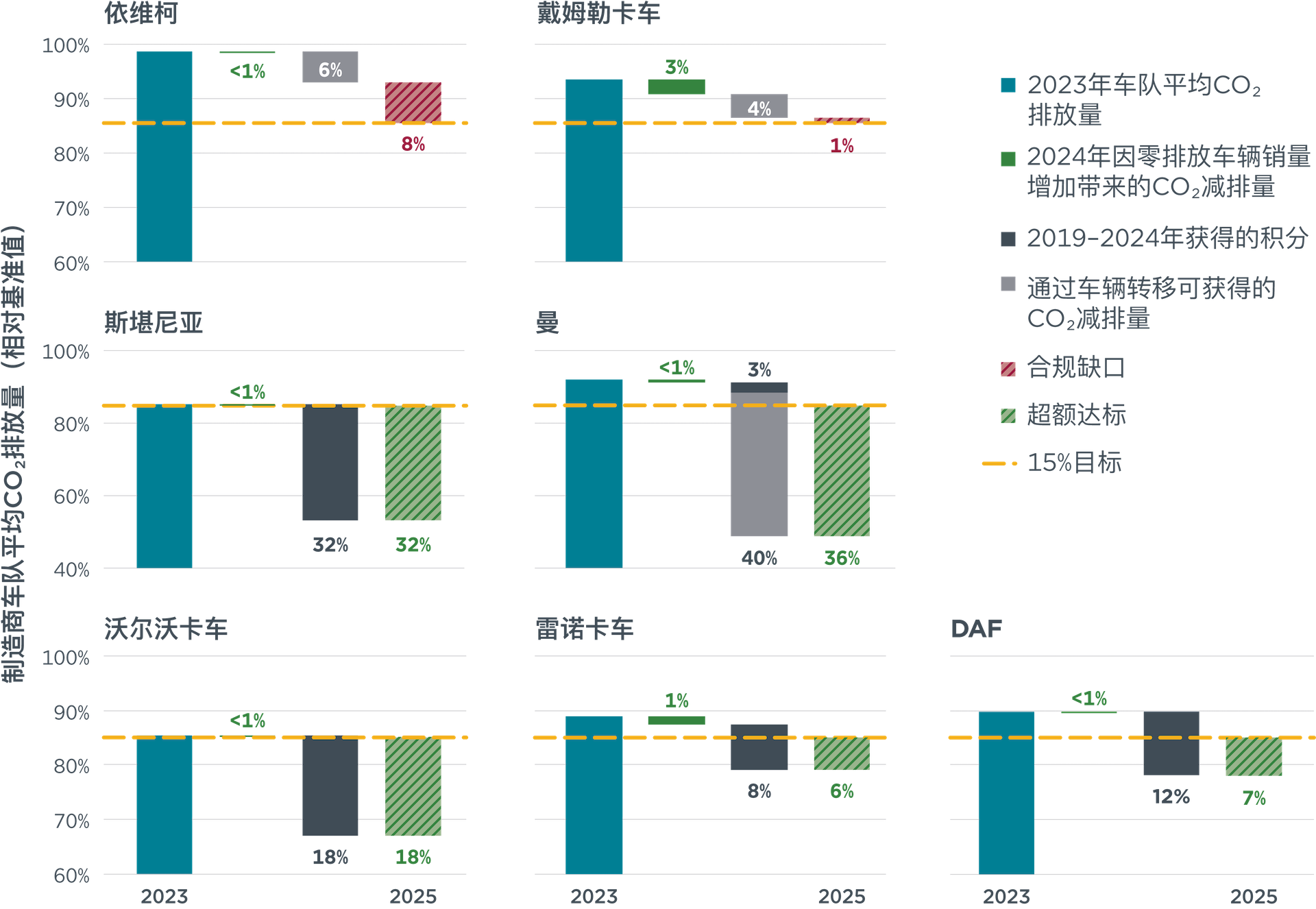 图2. 车辆制造商的车队平均二氧化碳排放量及其与2025年目标合规要求之间的差距