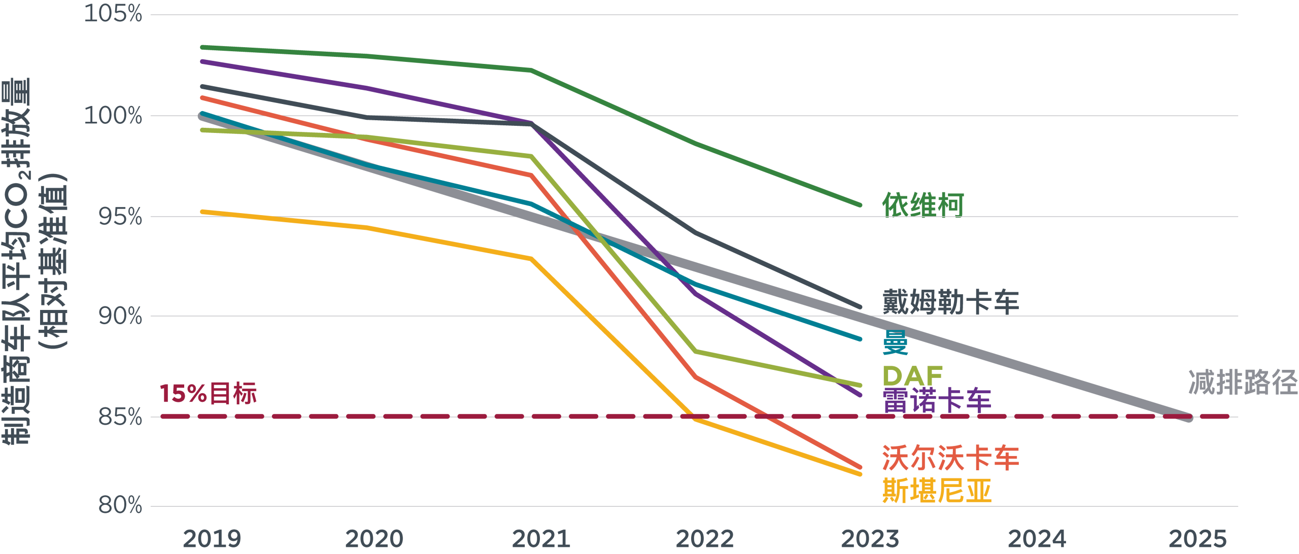 图1. 2019–2023年欧洲重型车制造商车队平均CO2排放量