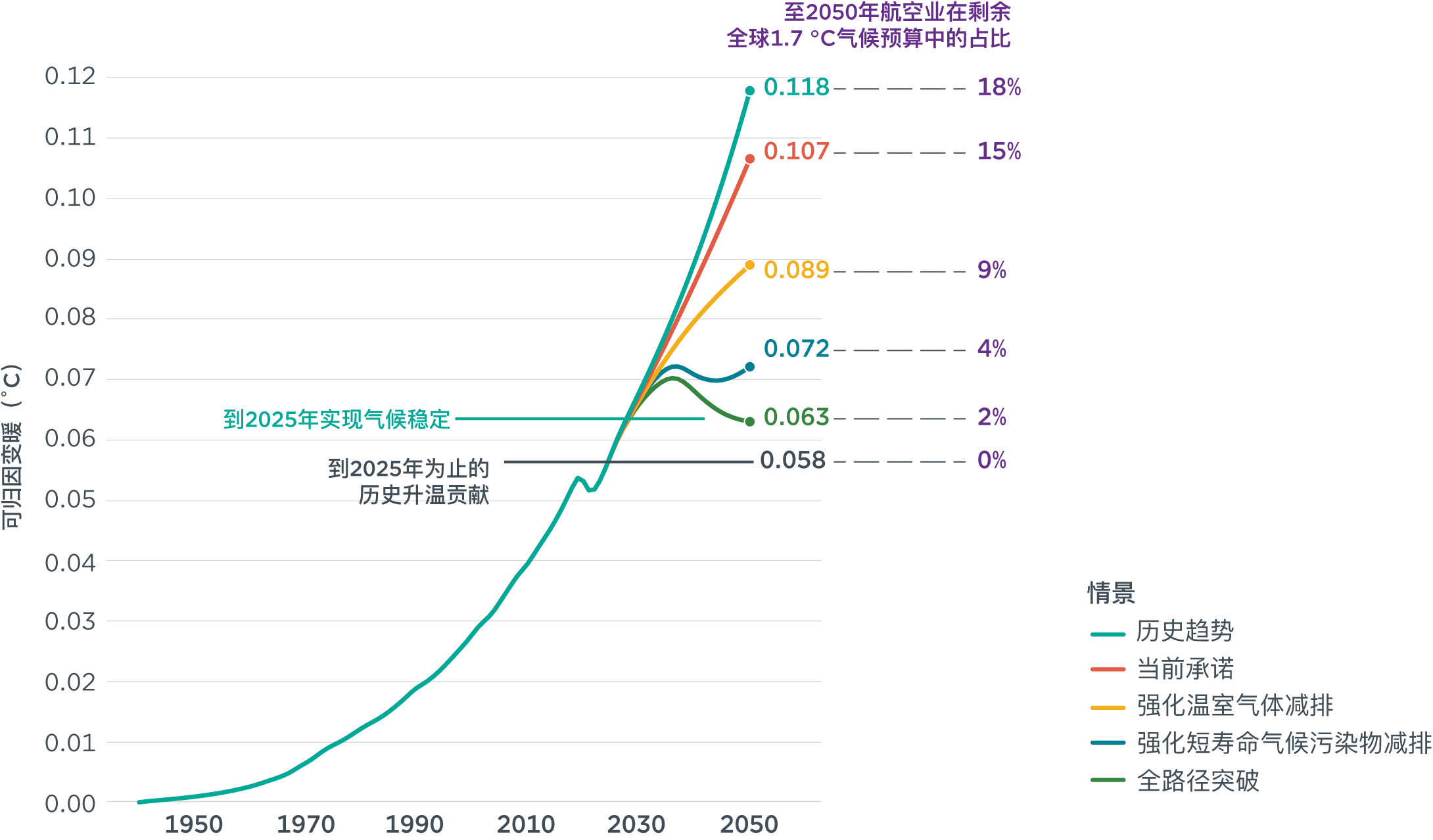 图1. 航空业历史升温贡献与各情景预测的未来升温贡献