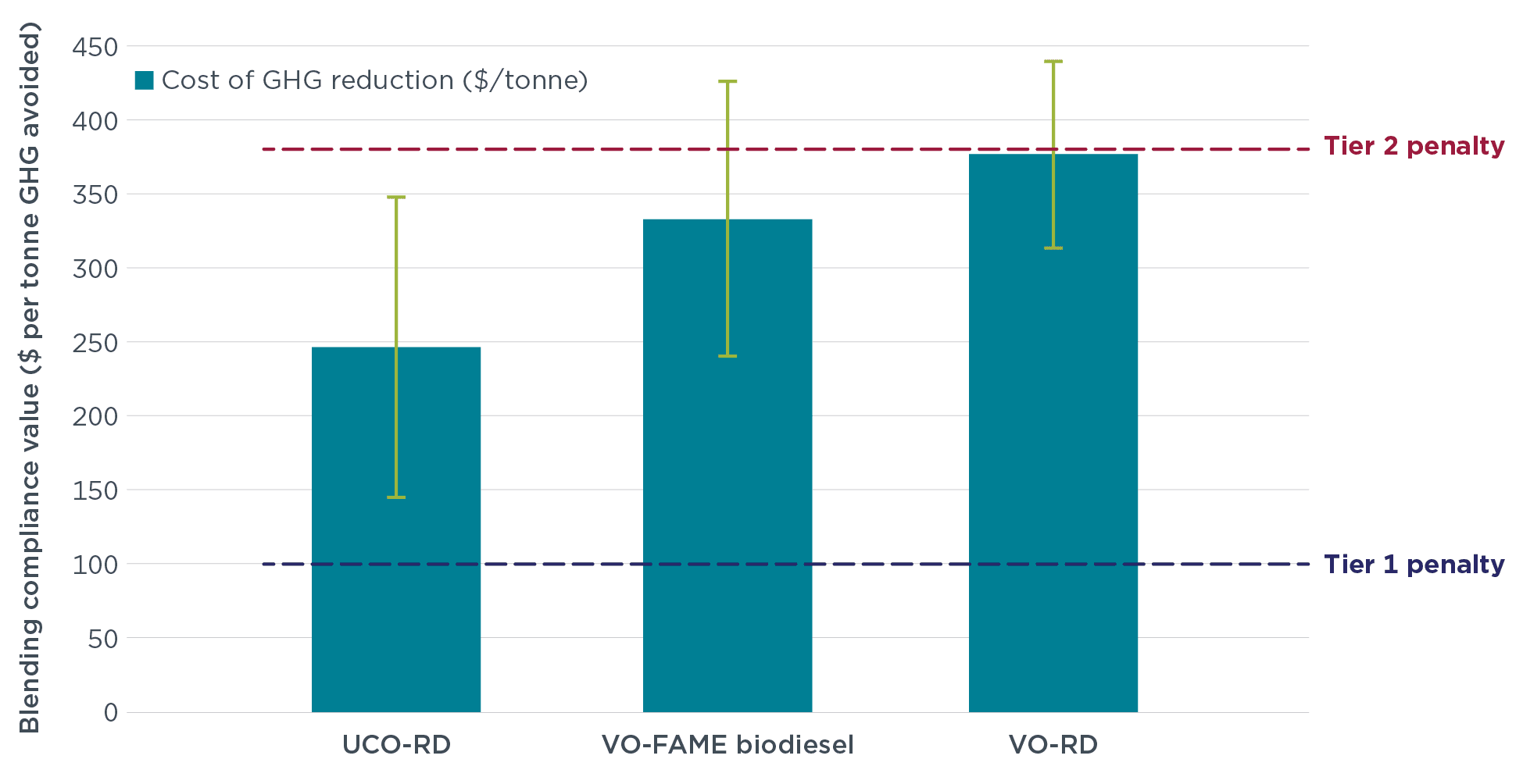 结果显示,根据当前生命周期评估(LCA)指南,使用生物燃料的合规成本低于基础合规成本。在所分析的生物燃料中,废弃食用油可再生柴油(UCO-RD)是最具成本效益的合规途径,其次是以植物油为基础的生物燃料。因此,船舶可以优先使用基于废弃食用油的生物燃料,以满足基础排放目标并避免更高的罚款。