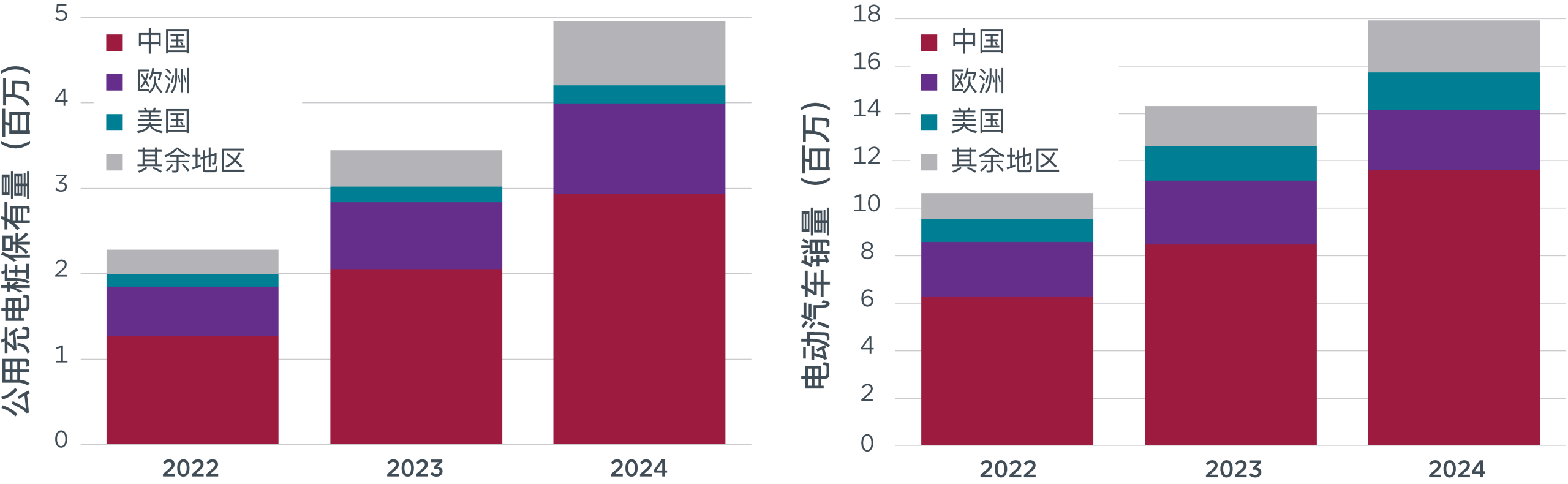 图1. 2022-2024年全球分市场的公用充电桩保有量(左)和电动汽车销量(右)
