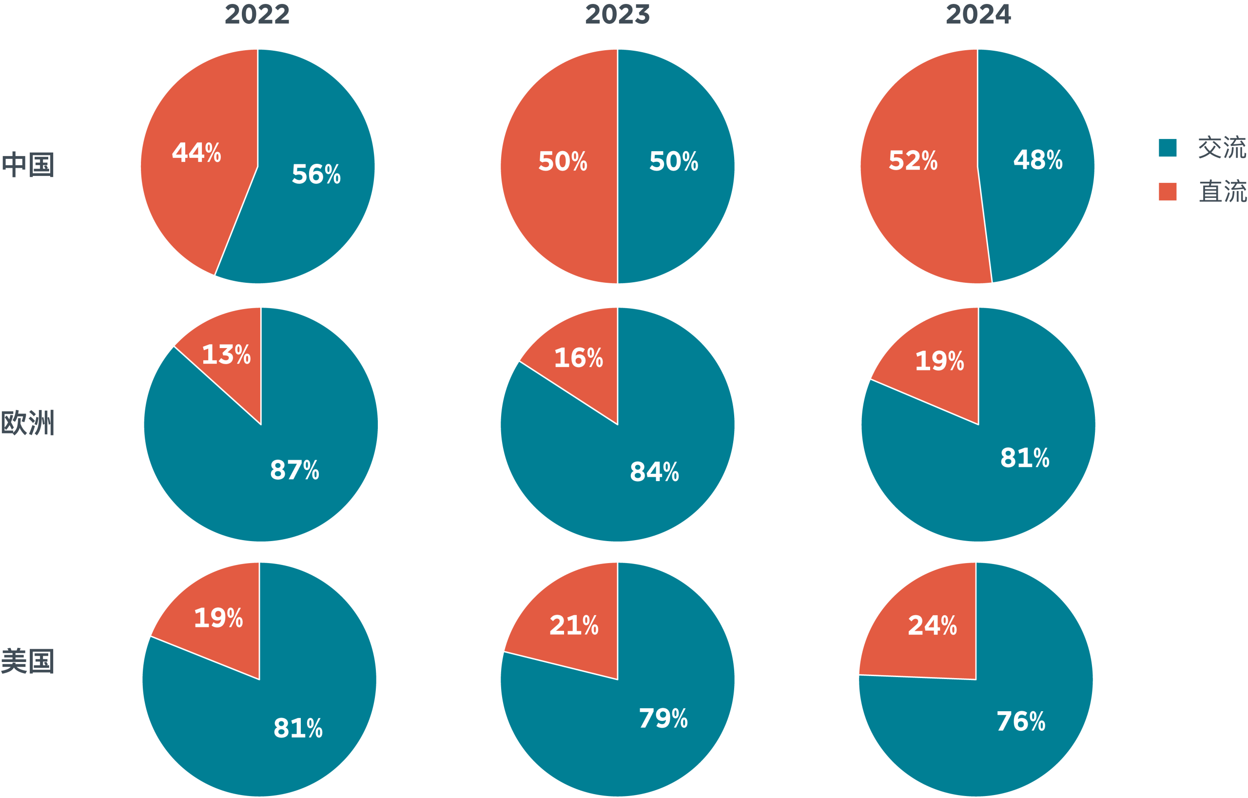 2022年至2024年间,全球范围内公用直流充电桩的增长速度快于交流充电桩,从而使直流充电桩在全球公用充电桩保有量中的占比从31%提高到39%。这种上升趋势在三大主要市场中表现得尤为明显。在中国,公用直流充电桩占比从2022年的44%提升至2024年的52%,首次超过交流充电桩,成为占比最高的充电类型。在欧洲,2024年直流充电桩占比为19%,高于2022年的13%;在美国,同期占比则从19%提升至24%。