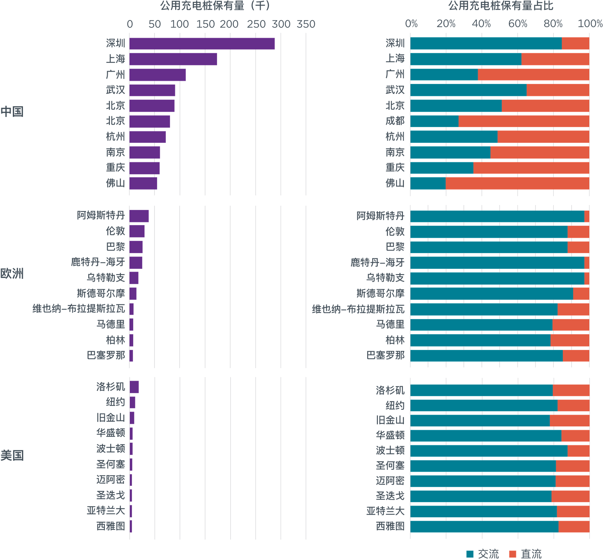 图3. 2024年中国、欧洲和美国公用充电桩保有量排名前十城市的公用充电桩保有量(左图)及交直流占比特征(右图)