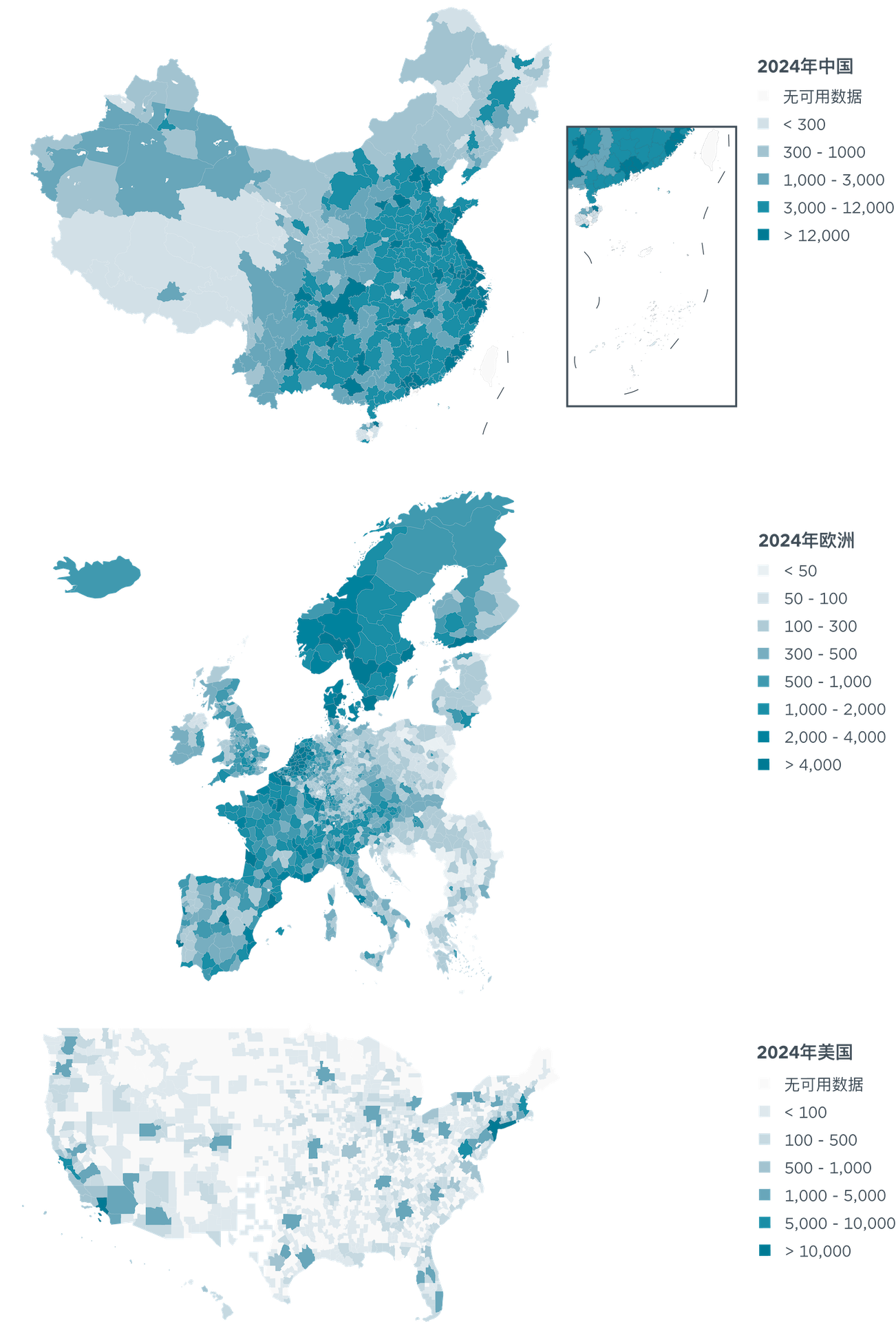 图6. 2022和2024年中国、欧洲和美国分城市的公用充电桩保有量