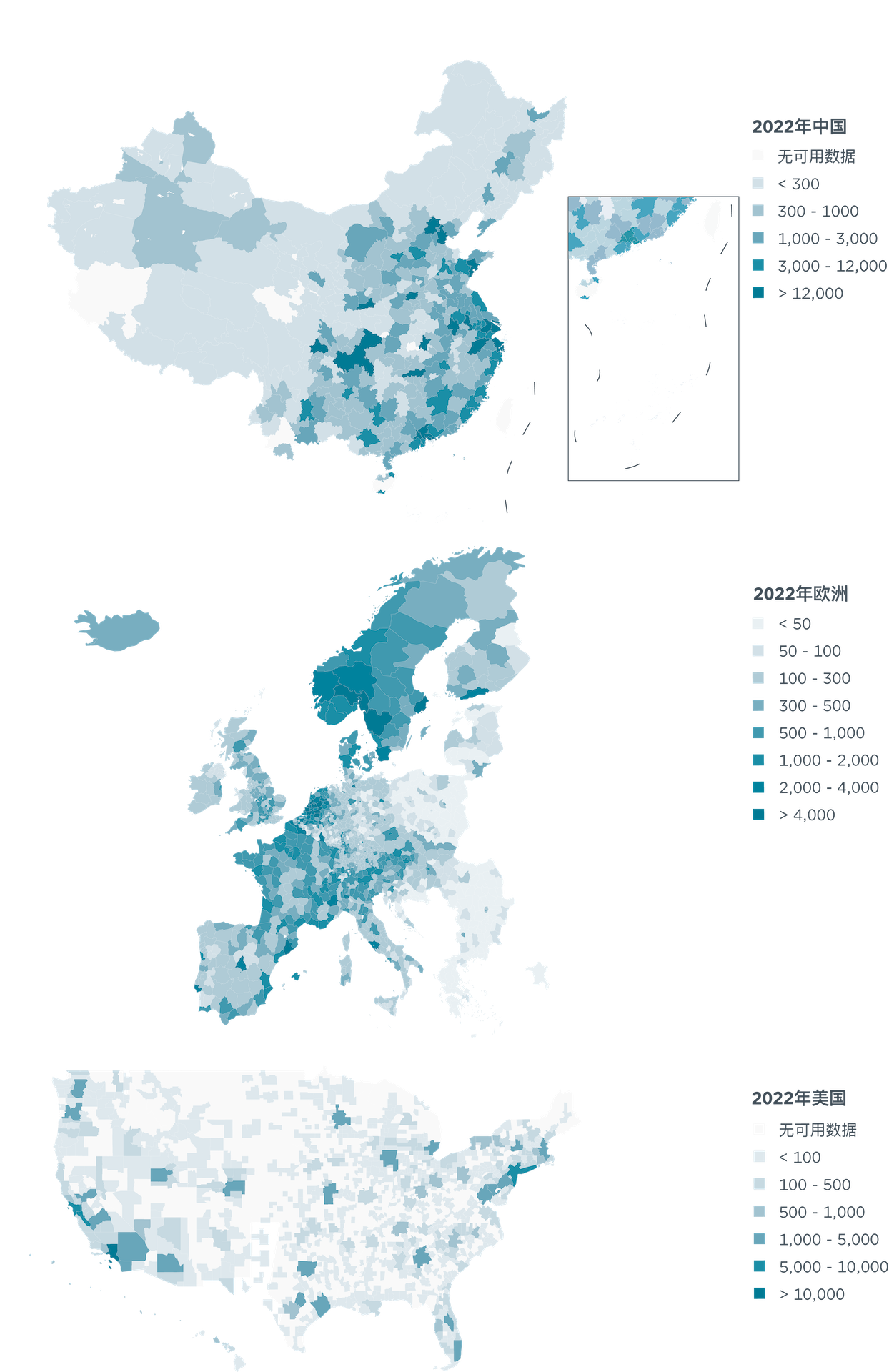 图6. 2022和2024年中国、欧洲和美国分城市的公用充电桩保有量