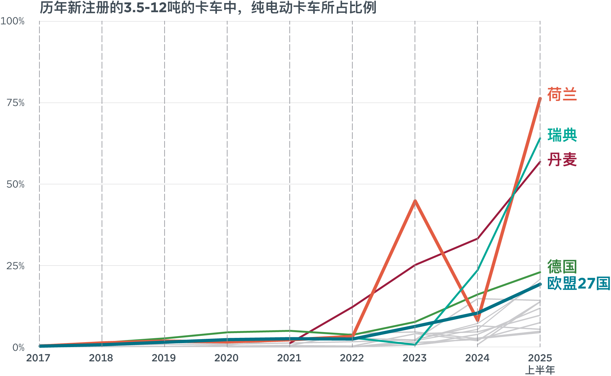 近年来,纯电动货车与卡车正在荷兰的道路上迅速涌现。如图1上图所示,2025 年上半年,荷兰新注册的纯电动货车(即纯电动轻型商用车,总质量不超过 3.5 吨)的市场占比从 2024 年上半年的 11% 飙升至 78%,在欧盟成员国中遥遥领先。中型卡车(3.5–12 吨)市场也出现类似趋势,其纯电动市场占比在同期从 8% 跃升至 76%(图1下)。