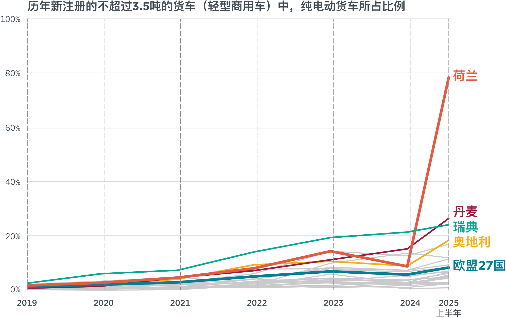 近年来,纯电动货车与卡车正在荷兰的道路上迅速涌现。如图1上图所示,2025 年上半年,荷兰新注册的纯电动货车(即纯电动轻型商用车,总质量不超过 3.5 吨)的市场占比从 2024 年上半年的 11% 飙升至 78%,在欧盟成员国中遥遥领先。中型卡车(3.5–12 吨)市场也出现类似趋势,其纯电动市场占比在同期从 8% 跃升至 76%(图1下)。
