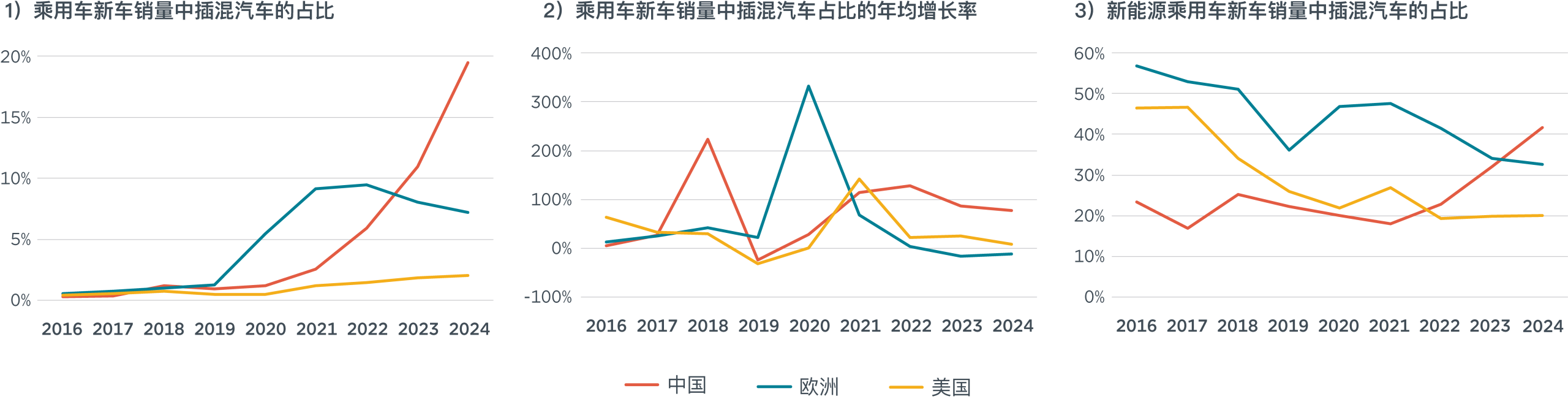 图1. 2016–2024年中国、欧洲和美国乘用车新车销量中插混汽车的占比(上)、该占比的年均增长率(中)、以及插混汽车在新能源乘用车新车销量中的占比(下)