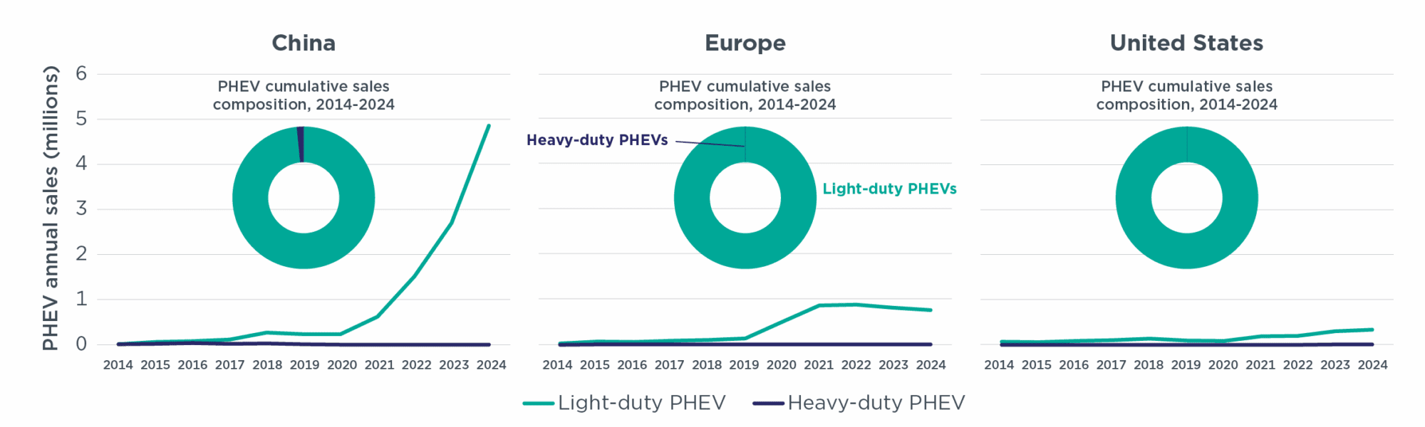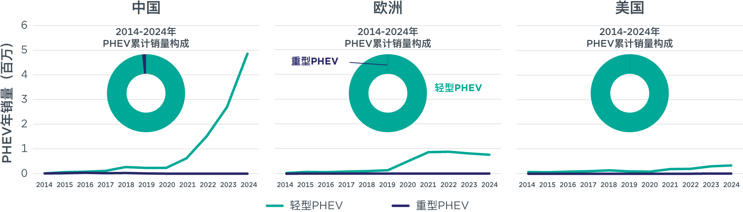 图. 2014–2024年中国、欧洲和美国的PHEV销量情况