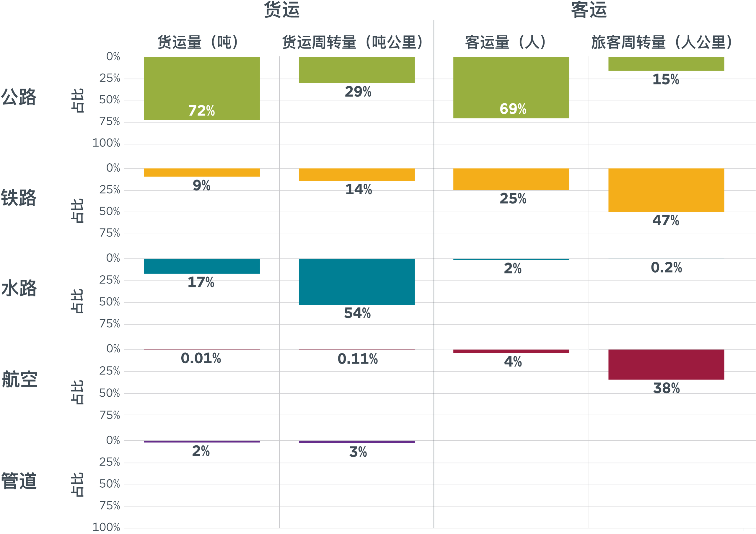 图1. 2024年中国按交通运输模式划分的旅客及货物周转量