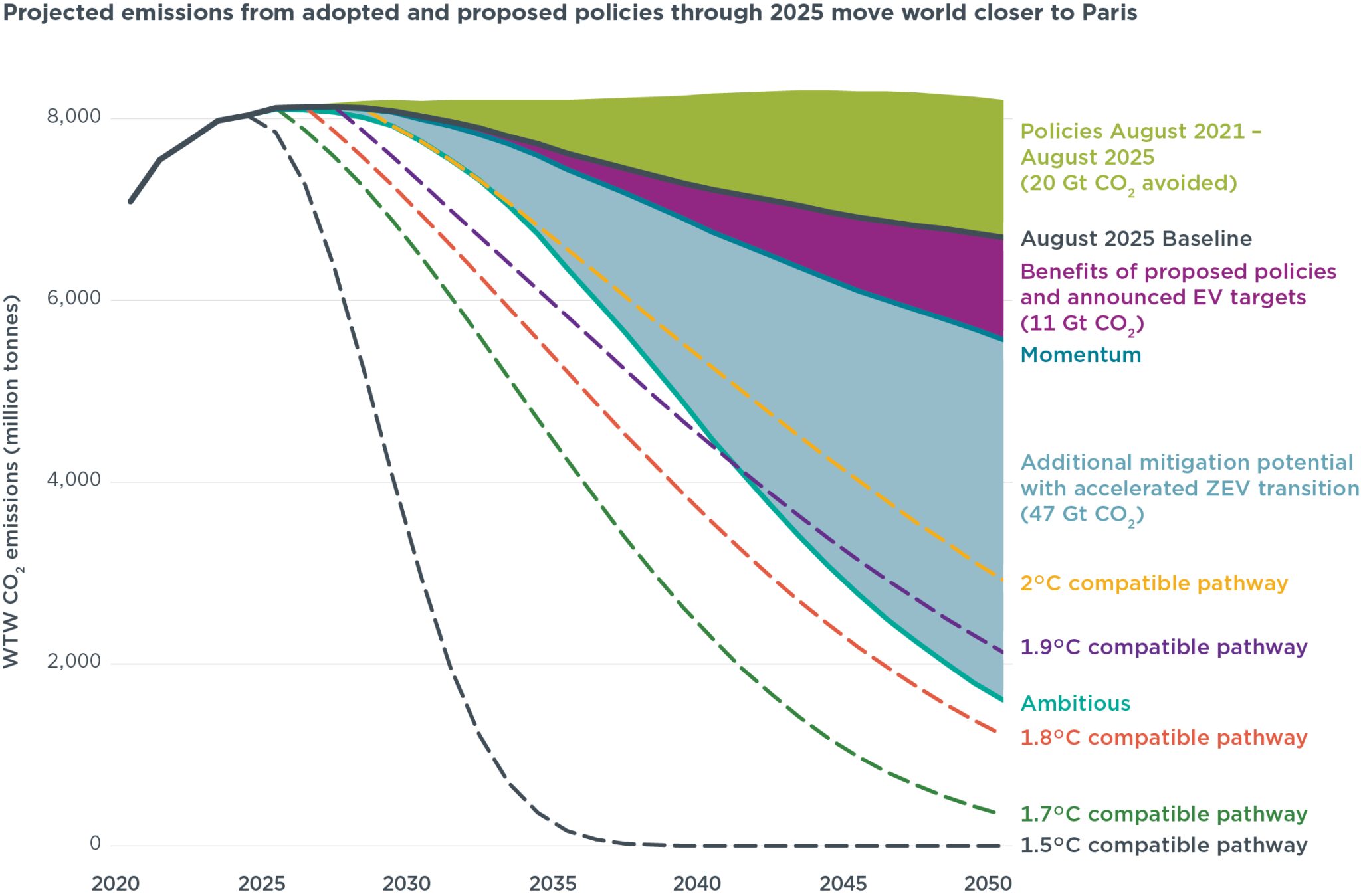过去四年落地的政策,已大幅降低2050年前全球二氧化碳排放预测值。2025基准情景显示,受主要市场法规推动新车零排放汽车占比提升、零排放汽车成本下降带动市场持续普及等因素影响,碳排放预计于2025年达峰后持续下降。这一发展轨迹较2021基准情景实现显著优化,截至2050年可累计减少200亿吨二氧化碳排放。