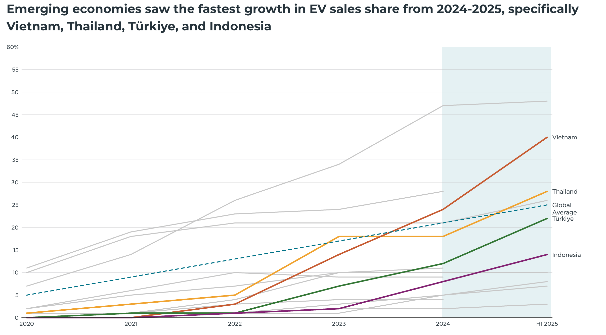 2024—2025年,包含零排放汽车与插电式混合动力汽车(PHEV)在内的电动汽车销量占比快速增长。中国仍是全球最大电动乘用车市场,而越南、泰国、土耳其、印度尼西亚等新兴经济体实现了最快增速。这一增长得益于优惠财税政策、本土制造业强势发展(越南、土耳其),以及高性价比中国进口车型的带动(泰国、印度尼西亚)。中国与欧盟在中重型货车零排放汽车普及领域处于全球领先,两大市场相关车型销量占比均突破两位数;2025年上半年,欧盟多国电动中型货车销量占比超50%,中国则在重型货车领域以两位数电动化占比领跑全球。