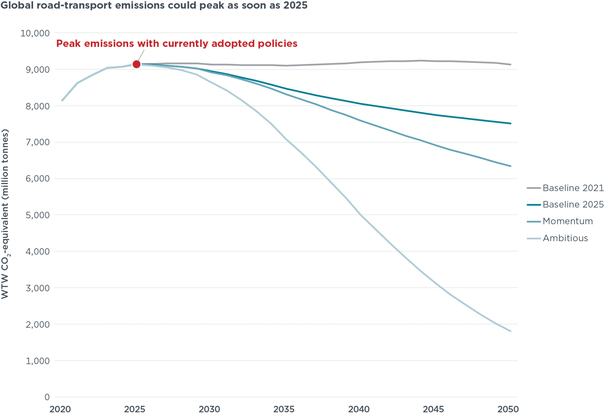 除最保守情景外,各情景下全球道路交通碳排放均预计于2025年达峰。这一拐点主要得益于中国、欧盟等大型市场通过提升车辆能效、推进电动化实现的减排成效。不过,碳排放达峰时间除受政策与市场因素影响外,还取决于交通出行量的增长态势。