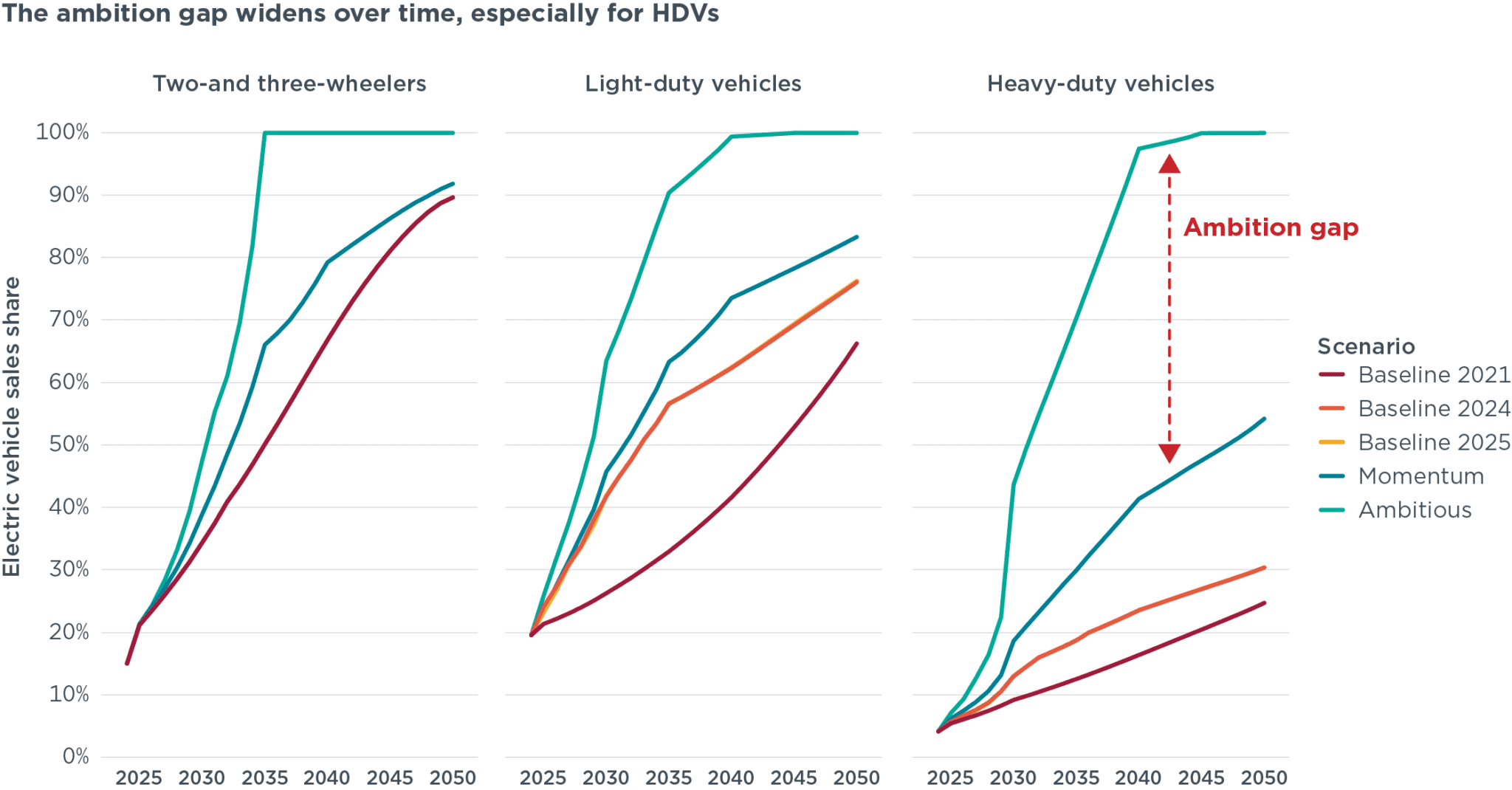 若实现发展势头情景下的既定目标与政策提案,相较于2021年政策情景,2050年前可减少310亿吨二氧化碳排放,占实现气候目标所需减排量的40%。但发展势头情景与契合《巴黎协定》的高目标情景之间,零排放汽车销量占比的预测缺口依然存在,且随时间推移持续扩大,重型货车领域的缺口尤为突出。