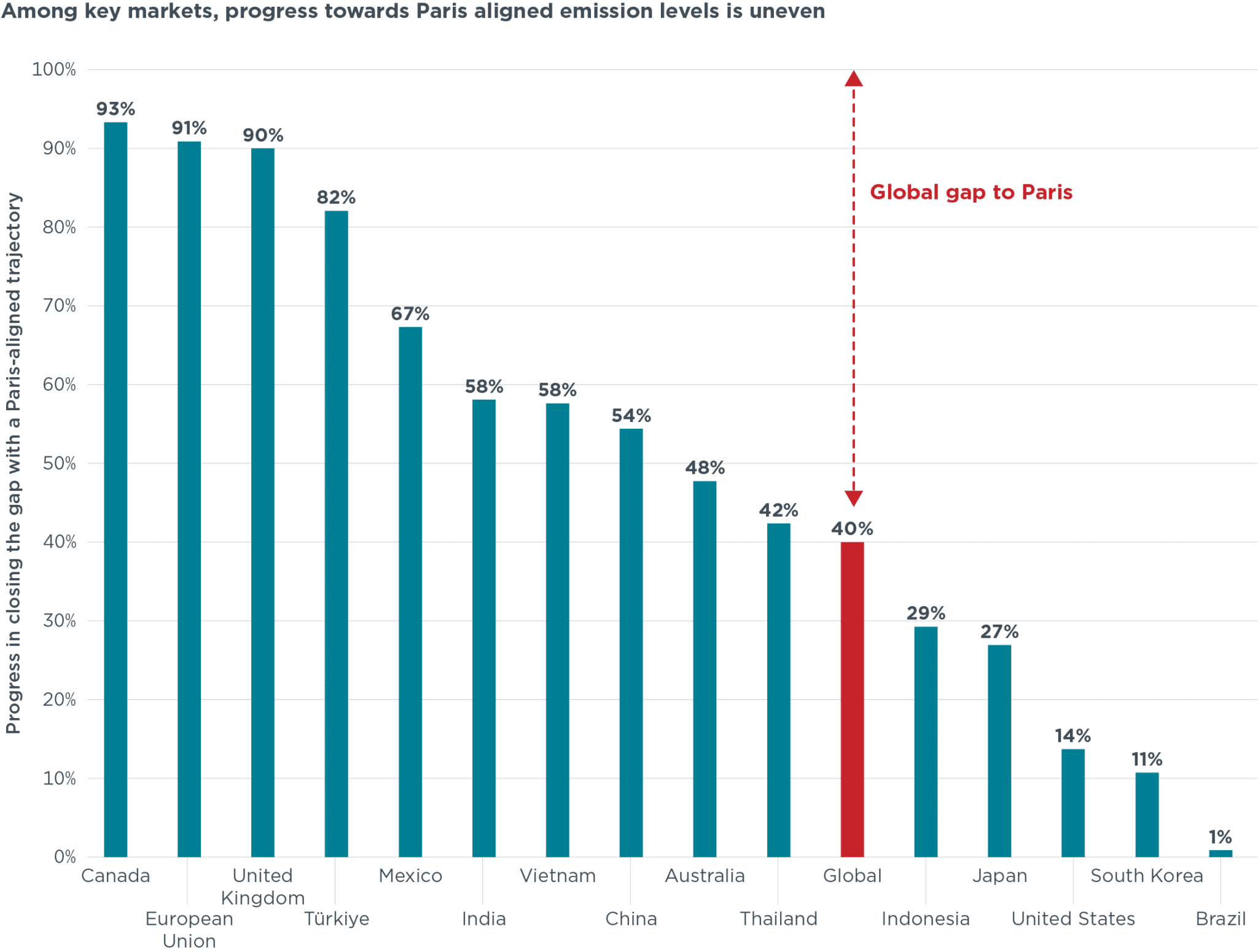 政策目标力度的差异,导致区域间减排缺口分化明显。发展势头情景下,加拿大、欧盟、英国可填补约90%的碳排放缺口,而巴西、韩国、美国的缺口填补率不足20%。美国是典型特例:政策撤销提案使其发展势头情景下的碳排放预测值,甚至高于基准情景。这一变化导致美国碳排放缺口填补率从2025基准情景的60%,骤降至发展势头情景的14%,对全球碳排放轨迹产生重大影响。