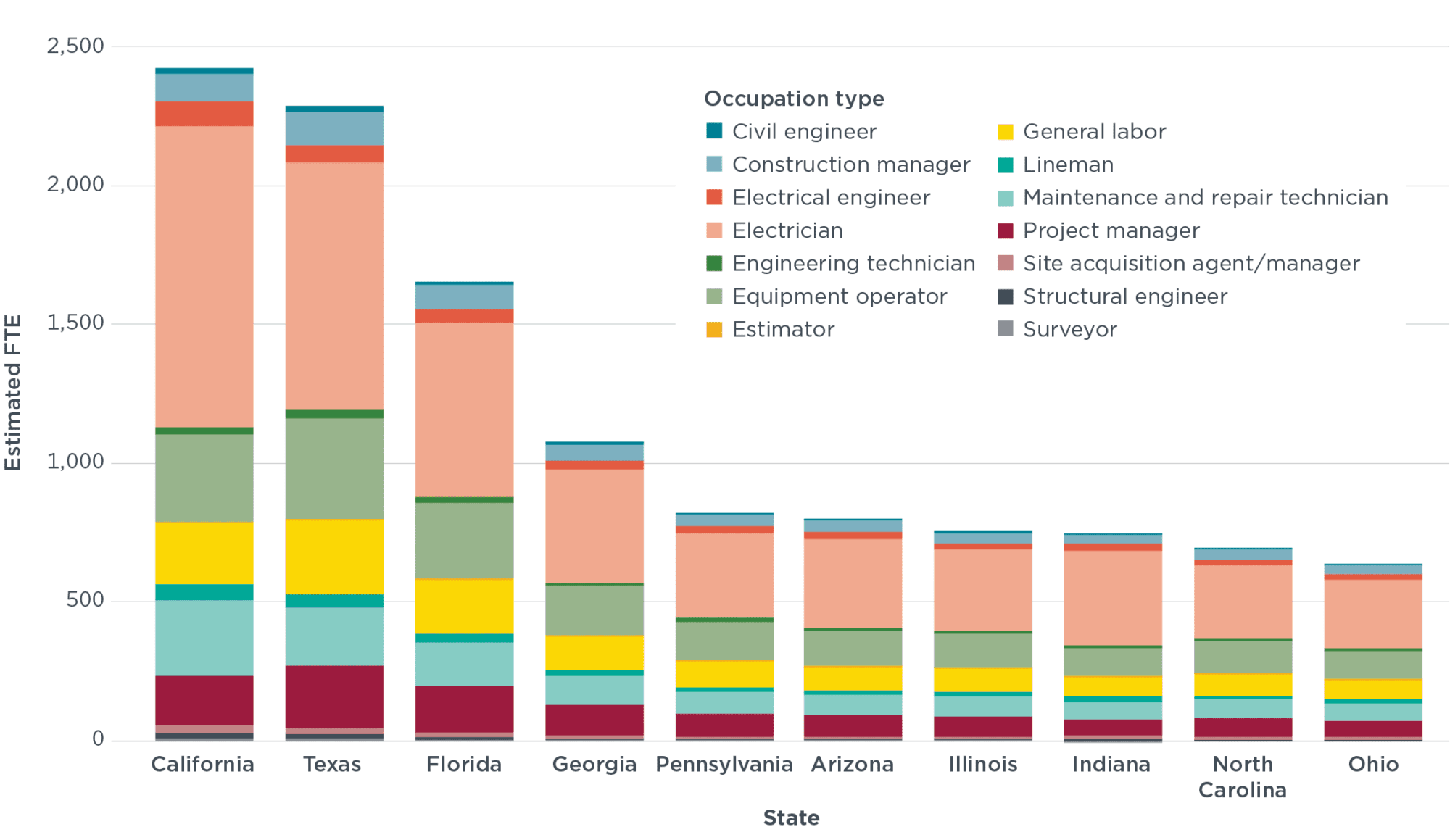 图. 2032年美国中重型车辆充电基础设施建设用工需求前十的州