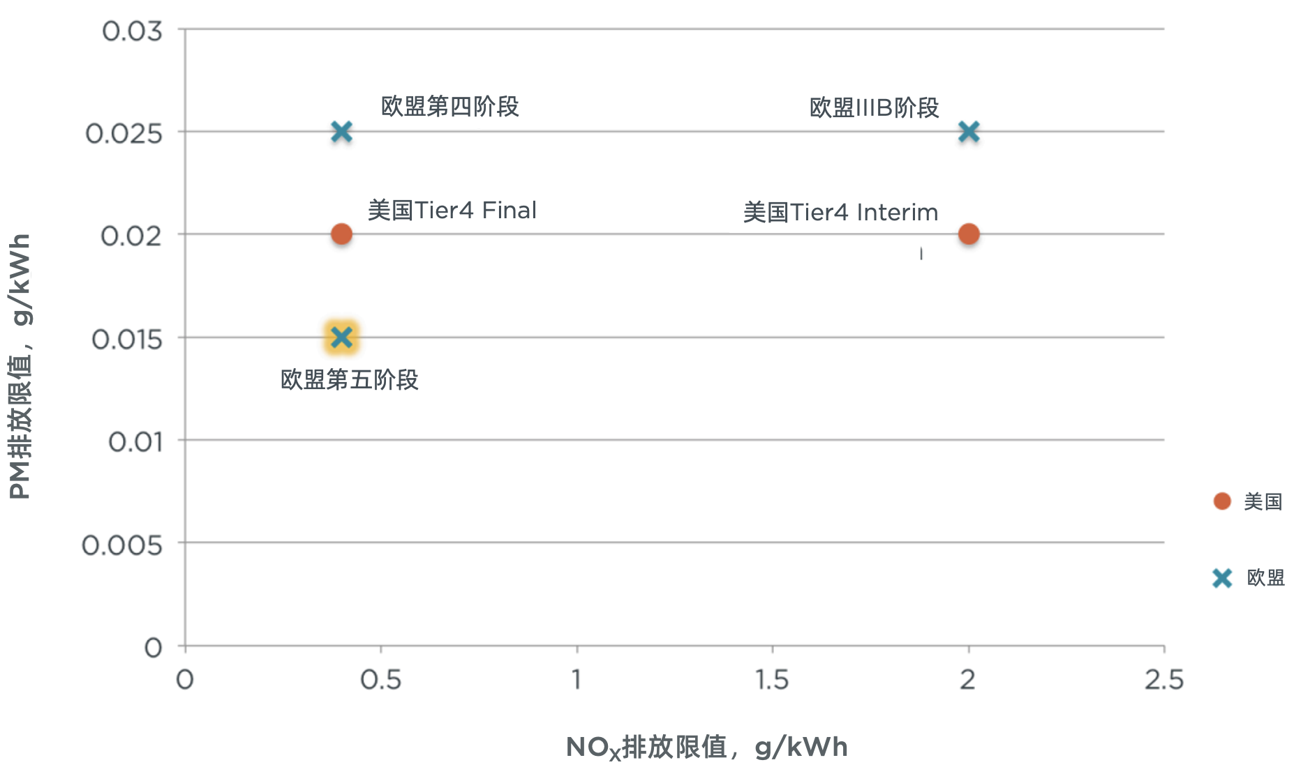 在第一和第二阶段标准下,发动机排放测试采用ISO 8178 C1标准中的8工况循环进行测量,单位为克/千瓦时(g/kWh)。测试所使用的燃油含硫量为0.1%–0.2%(质量百分比)。