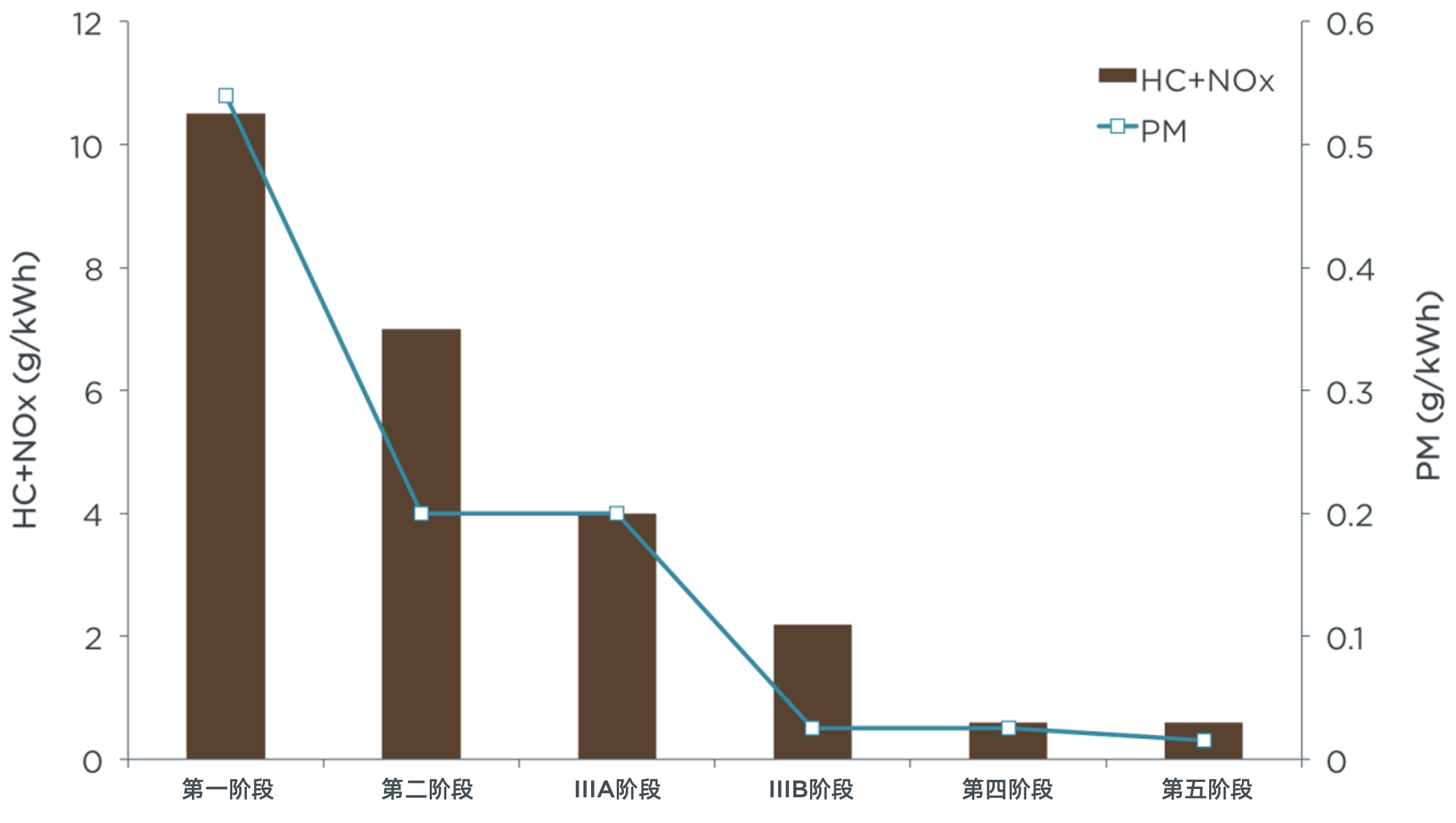 图2. 第一阶段至第五阶段HC+NOX及PM排放限值