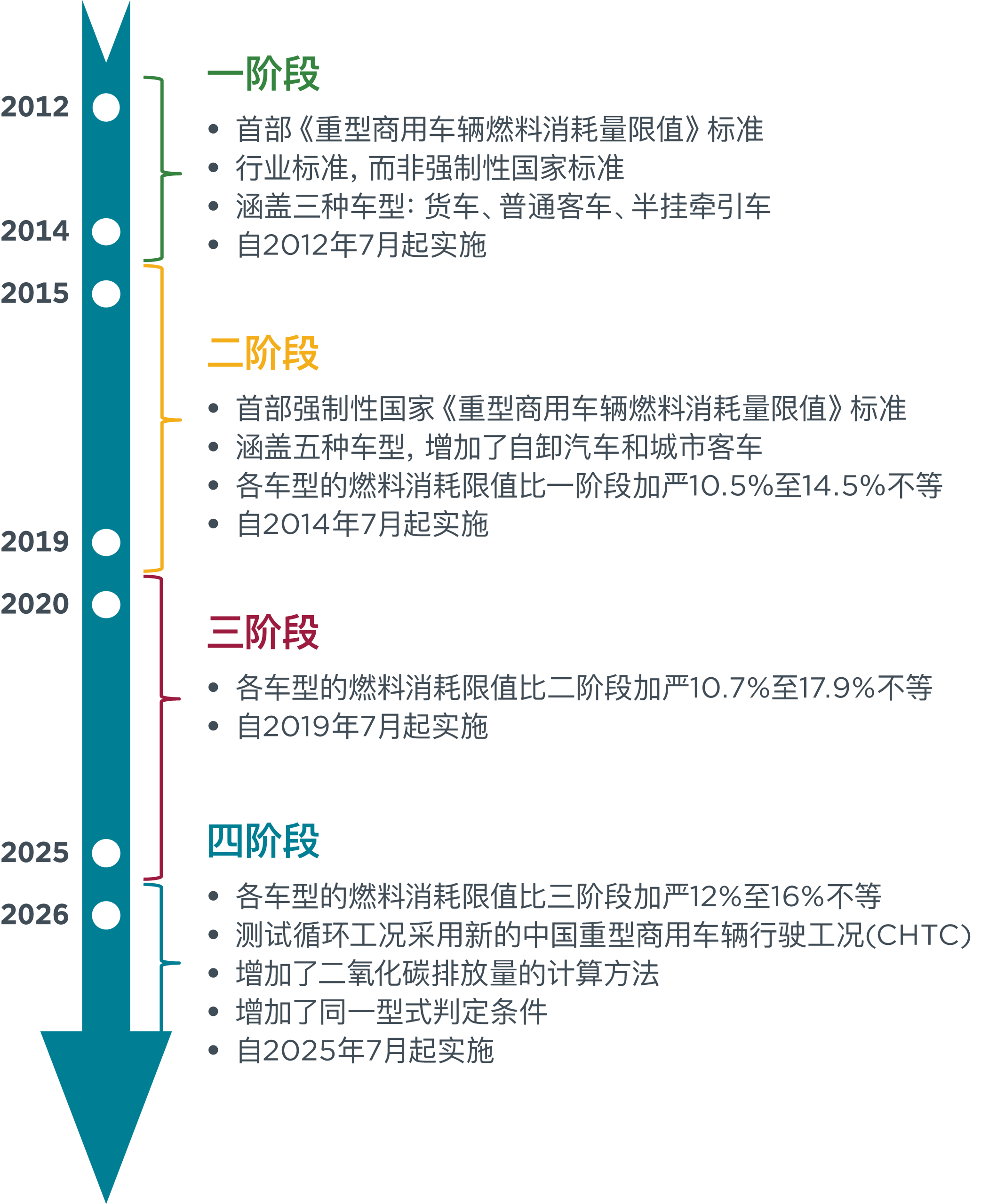 油耗(能效)标准是推动道路运输领域降碳的重要抓手,我国自2012年起陆续建立起重型商用车燃料消耗量限值标准体系,经历了第一阶段至第四阶段的连续升级,已逐步实现从“车型能耗管理”到“整车全生命周期节能监管”的体系化发展。